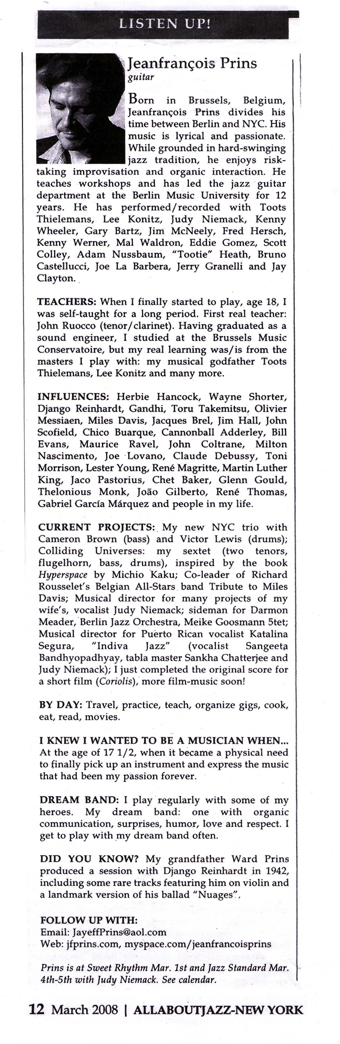 Listen Up! Jeanfrançois Prins – All About Jazz New York
